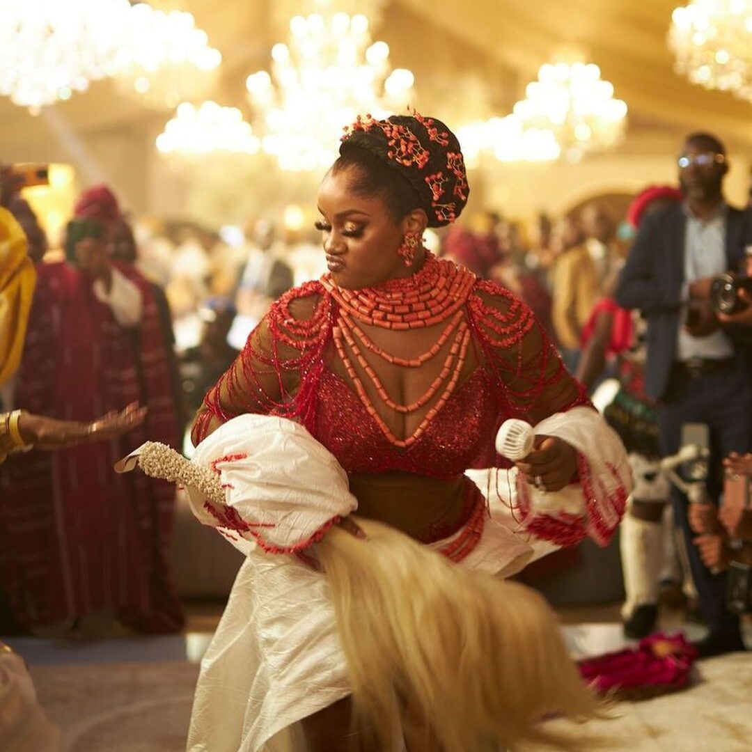 Des célébrités telles que Patoranking et le chanteur Paul Okoye, ou encore Eni Edo, Don Jazzy, Kcee et Olamide ont honoré l’occasion. Au-delà d’une grande célébration de l’union, ce mariage a été une véritable immersion dans les traditions ancestrales nigérianes. Les deux amoureux ont changé de tenues à chaque étape importante de la cérémonie, des tenues toujours traditionnelles et très éclatantes. Le marié arborant des « Isiagu », notamment des tuniques brodées, tenant une canne en bois rouge et d’autres symboles comme le lion pour représenter la force. Quant à la mariée, elle a été sublimée par le « gele », le légendaire foulard traditionnel nigérian. Sans oublier des colliers de perles, ou encore le George Wrapper, une étoffe luxueuse richement décorée, ainsi qu’une queue d’animal blanc à la main, telle une reine. Davido étant Yoruba, une ethnie qui se caractérise par son dynamisme et sa femme Chioma étant Igbo, une ethnie où les mariages sont célébrés avec une extravagance et un symbolisme inouï, leur union a été un cocktail du beau et de la diversité.