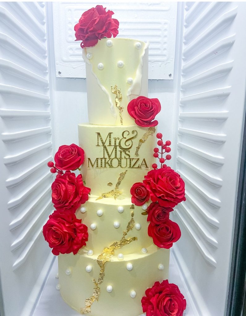 Valencia EFANGA ONIANGUÉ : Le plus grand gâteau de mariage que j’ai réalisé : 8 étages entièrement recouverts de pâte à sucre. Il a fallu faire venir de la pâte à sucre d’une qualité premium, de la déco, etc… de la France. On a travaillé 5 jours d’affilée sur cette pièce montée. La logistique n’a pas été facile, il a fallu la ramener en pièce détachée pour l’assembler sur le lieu de l’événement.